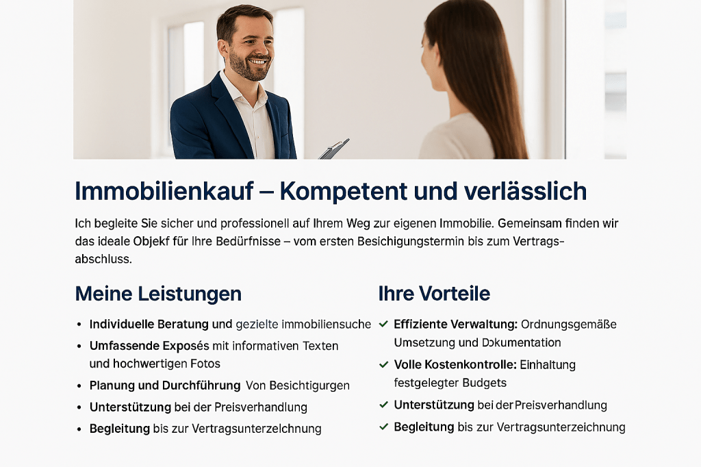 Ich begleite Sie sicher und professionell auf Ihrem Weg zur eigenen Immobilie. Gemeinsam finden wir das ideale Objekt für Ihre Bedürfnisse – vom ersten Besichtigungstermin bis zum Vertragsabschluss.