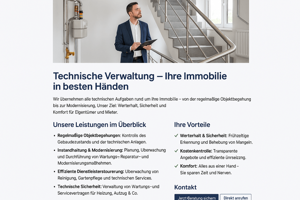 - Regelmäßige Objektbegehungen: Kontrolle des Gebäudezustands und der technischen Anlagen.