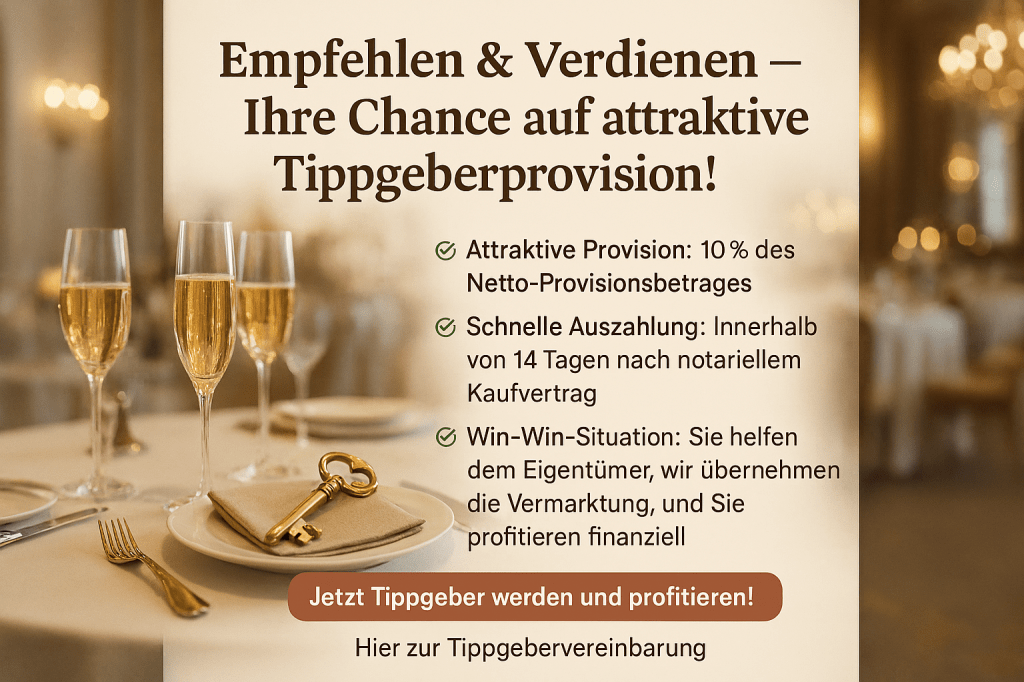 Stellen Sie sich vor: Ein kurzer Hinweis von Ihnen kann bares Geld wert sein! Sie kennen jemanden, der seine Immobilie verkaufen möchte? Dann werden Sie unser Tippgeber und sichern Sie sich 10 % der Netto-Maklerprovision – einfach, transparent und fair.